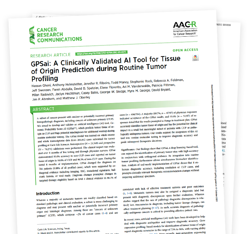Cancer of Unknown Primary (CUP) diagnosis is typically treated empirically and has very poor outcomes, with median overall survival less than one year.1 Caris GPSai, a Genomic Probability Score, uses whole exome (DNA) and whole transcriptome (RNA) sequencing coupled with trained and validated neural networks to aid in identifying the tissue of origin.